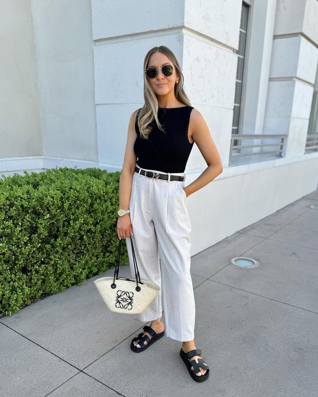 Цей ансамбль підходить для більшості фігур і особливо добре підходить для проміжного дрес-коду, що робить його основним у ці теплі місяці. Хоча босоніжки створюють невимушену атмосферу, перехід на закриті туфлі чи туфлі на підборах може адаптувати образ до суворіших офісних стандартів.