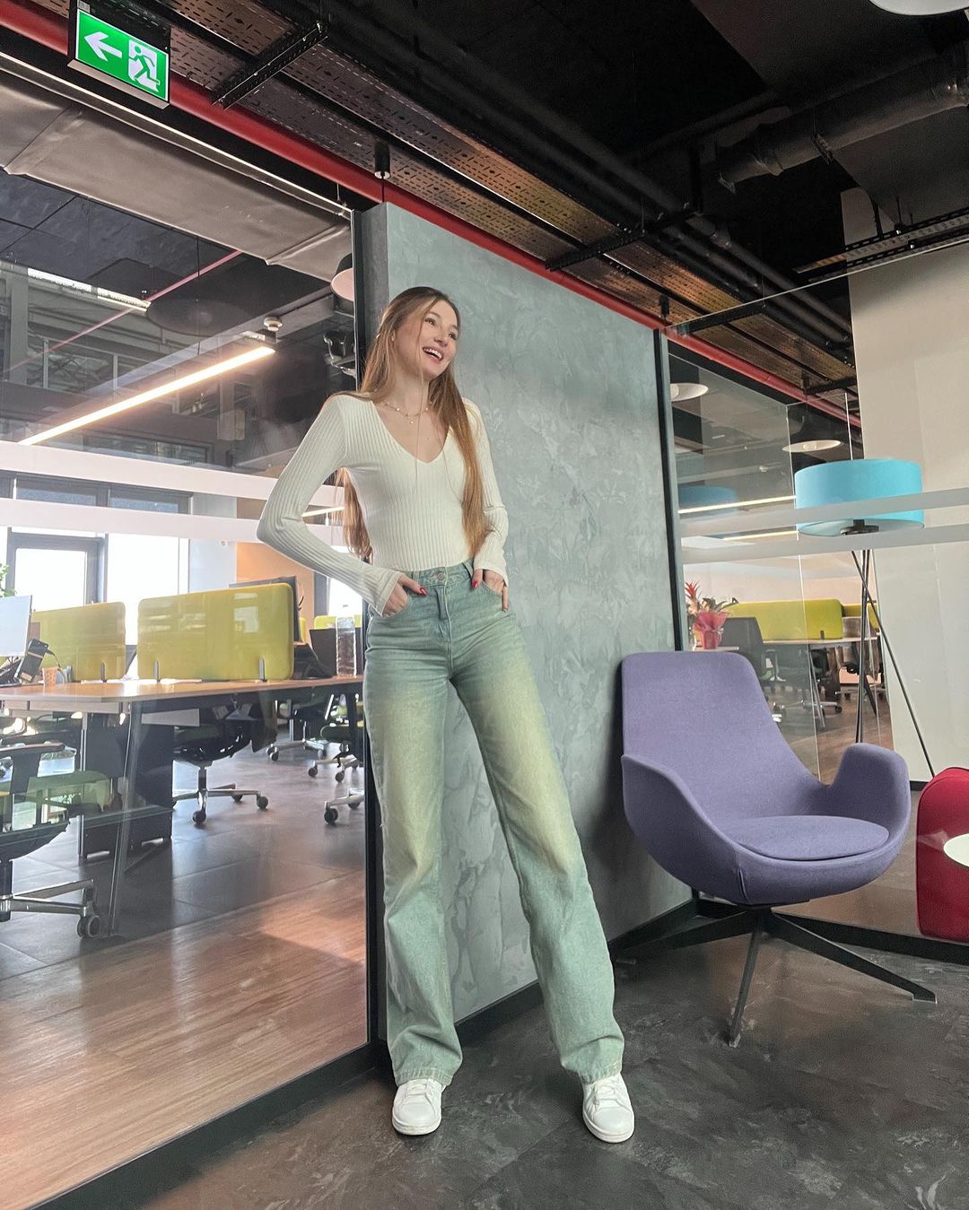 - Джинси: світлий денім зі зручною посадкою, ідеальний для повсякденної п’ятниці.