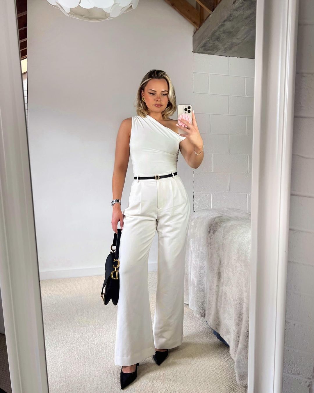 - Комбінезон: білий комбінезон на одне плече, який є втіленням шикарного літнього робочого одягу.