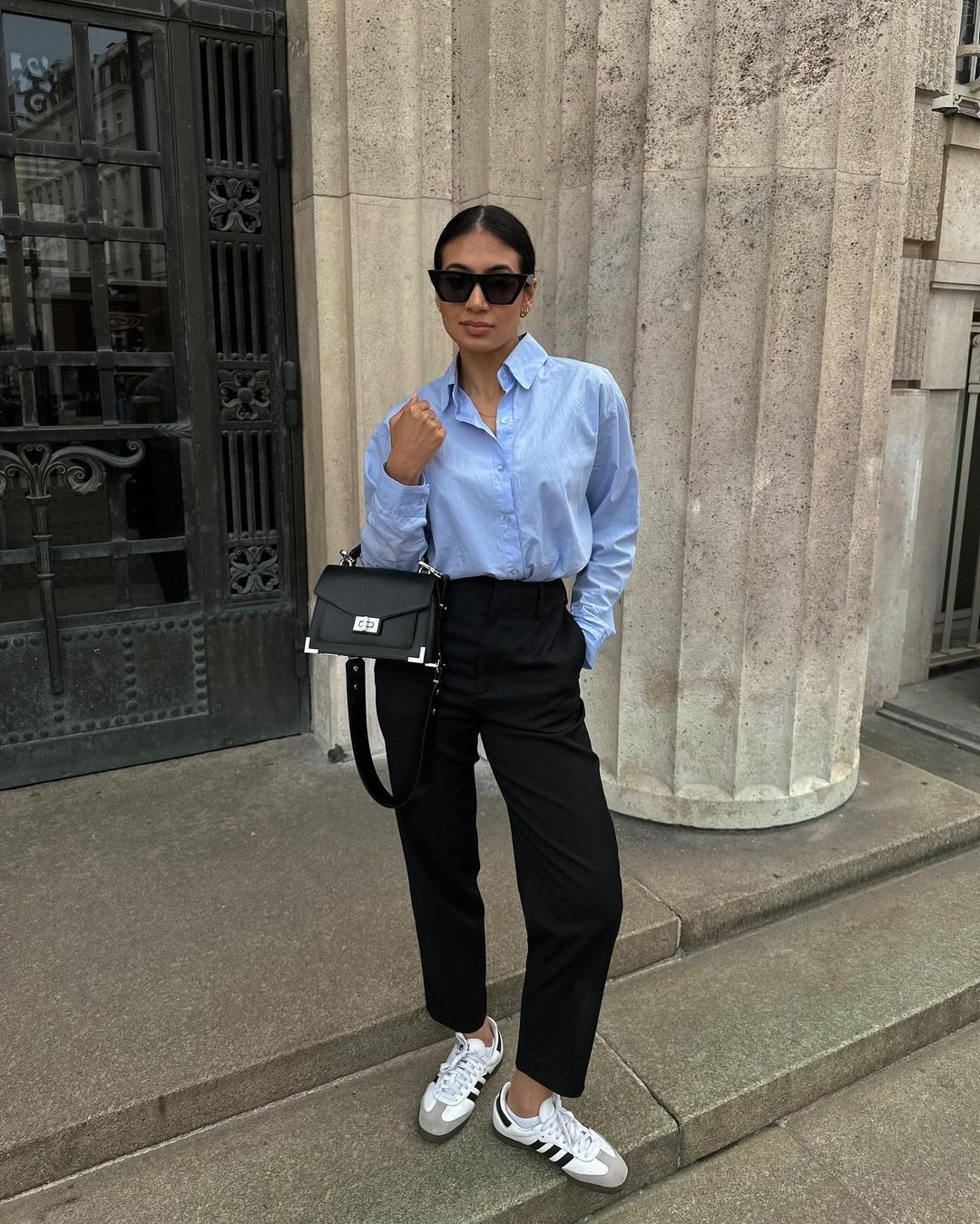 Це вбрання, яке підійде багатьом фігурам, можна легко вписати в різні робочі місця, замінивши кросівки на більш формальне взуття. Це свідчення універсальності класичних речей у сучасному гардеробі.