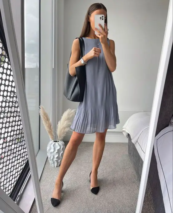- Сукня: світло-сіра сукня прямого крою з плісированими деталями.