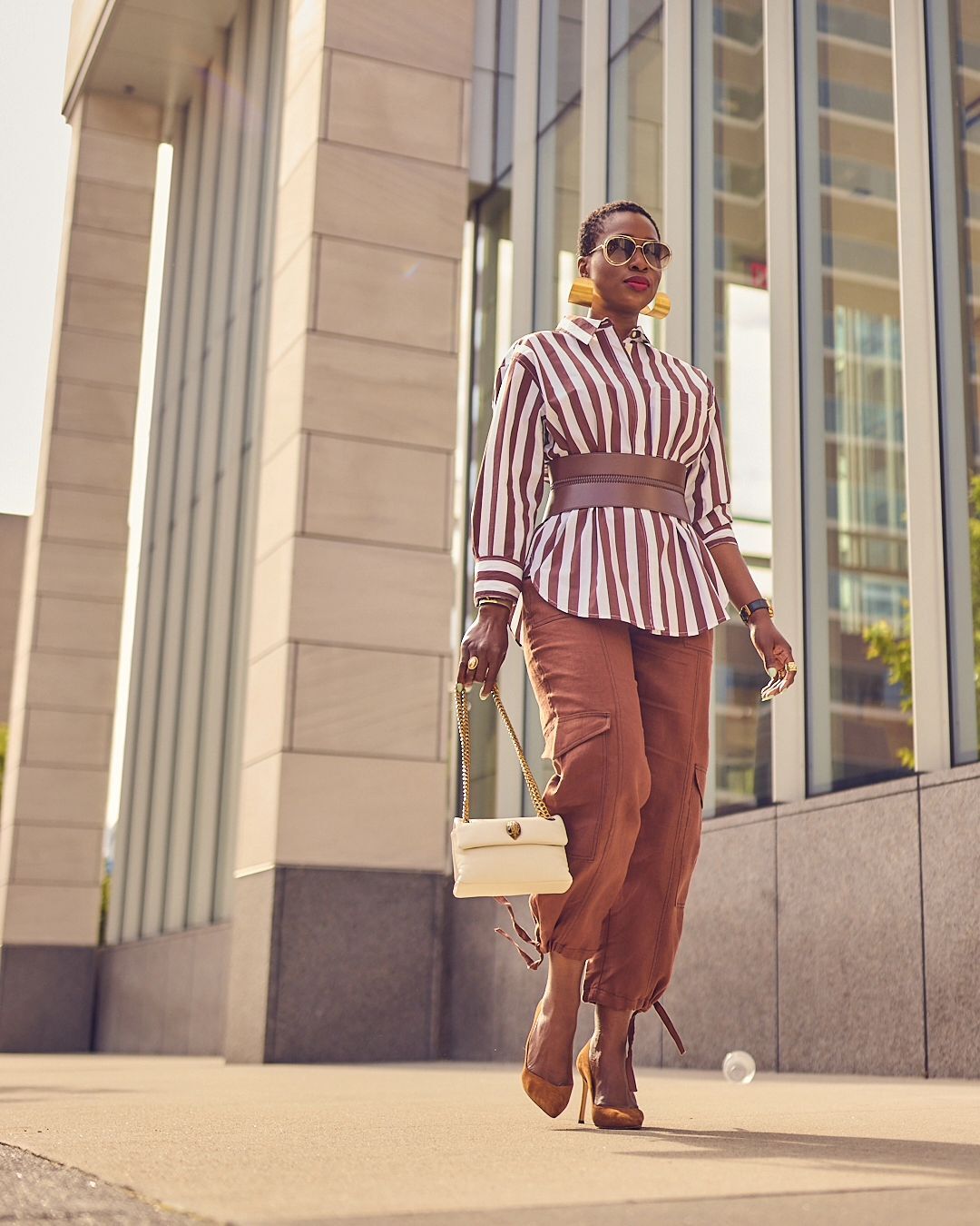 - Штани: струмуючі штани кольору іржі додають відтінок землистості гострим смужкам.