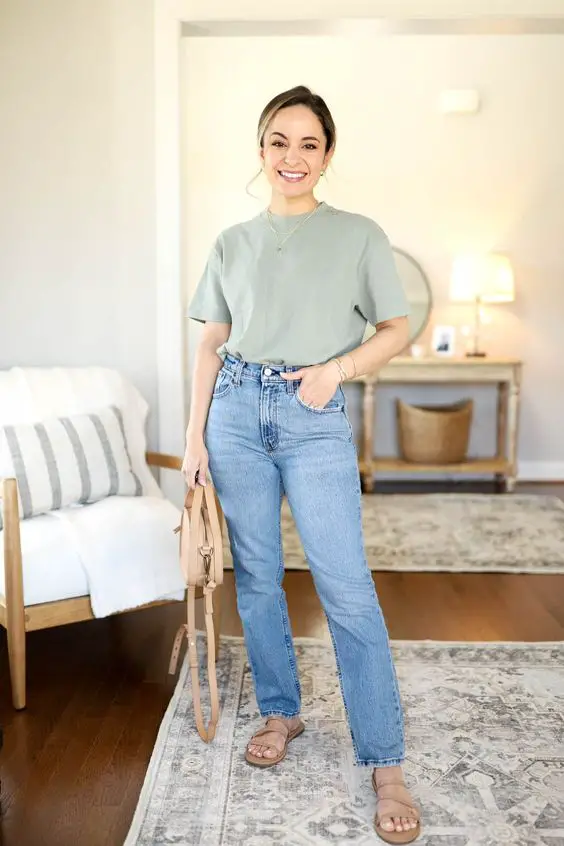 - Футболка: м’яка приглушена зелена футболка заправлена на пояс, створюючи чистий і невигадливий образ.