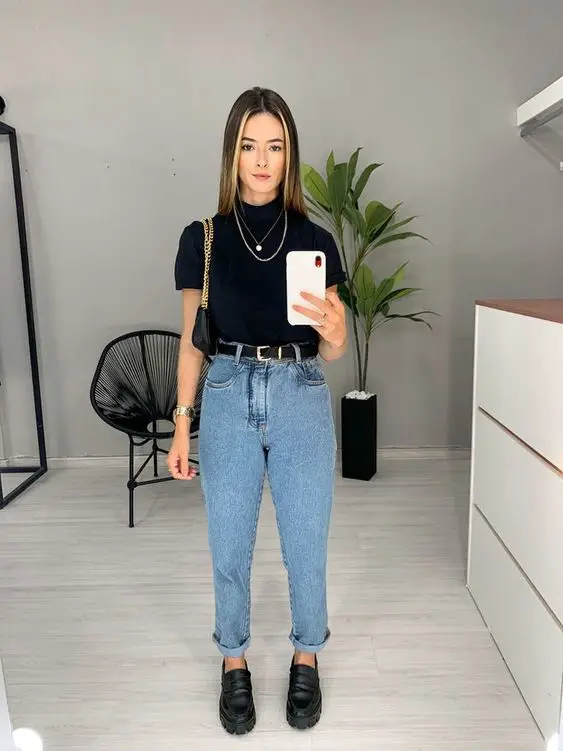 Милі літні робочі костюми для жінок часто включають позачасову привабливість деніму. Цей ансамбль із шикарною водолазкою та джинсами вільного крою забезпечує ідеальний баланс між невимушеністю та готовністю до роботи.