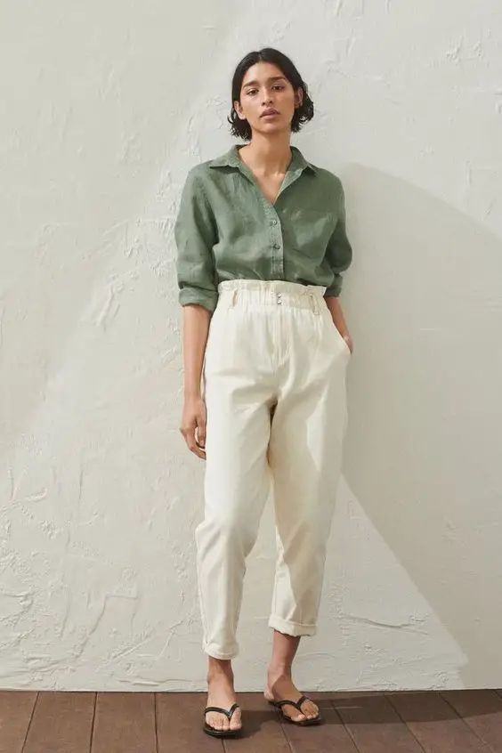 У змінюваному ландшафті жіночого літнього робочого одягу все більше цінуються розслаблені крої, які все ще виглядають зібраними. Цей ансамбль поєднує легкі оливково-зелені ґудзики з легкими кремовими брюками, створюючи невимушений і вишуканий образ.