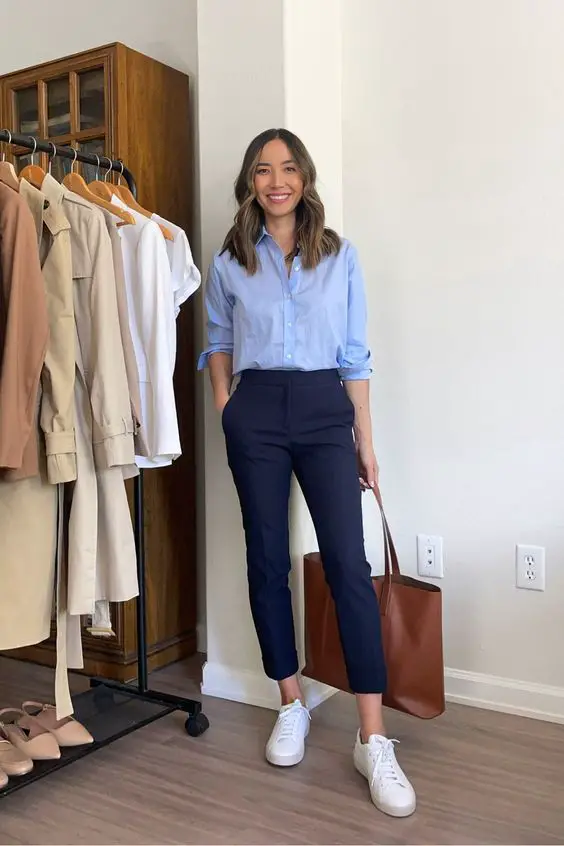 Вивчаючи літні робочі костюми, які жінки можуть носити в більш традиційних умовах, це класичне поєднання синьої сорочки та темно-синіх штанів — це урок вічної привабливості. Це професійно, зручно та неформально, щоб відповідати літньому сезону.