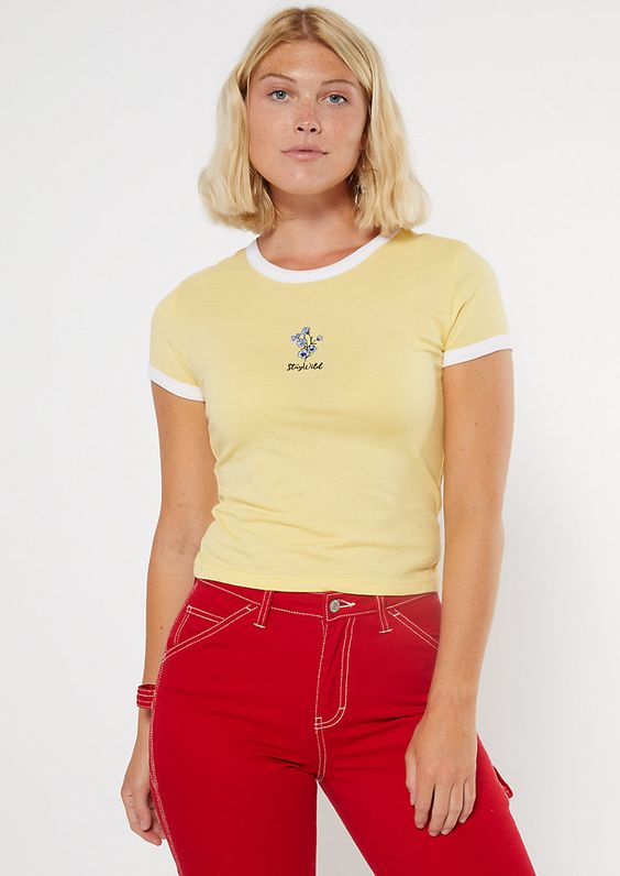 На цьому образі представлена жовта футболка в ретро-стилі з контрастною білою обробкою, яка додає ностальгічний відтінок сучасному вбранню. Цей стиль ідеально вписується в категорію милих літніх футболок для жінок, пропонуючи позачасову привабливість із сучасним відтінком.