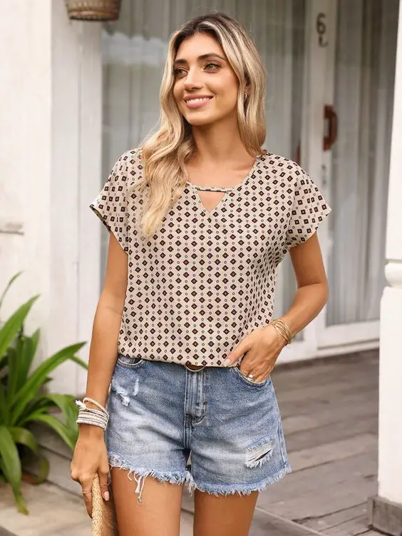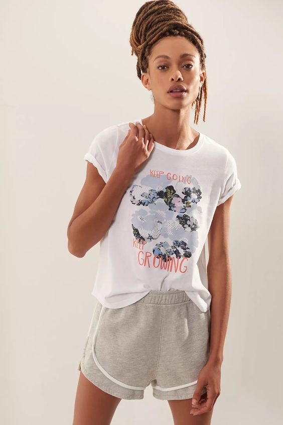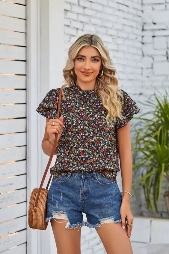 Молодіжний і свіжий літній образ демонструє футболку з квітковим принтом у поєднанні з класичними джинсовими шортами. Це вбрання ідеально втілює тенденцію милих літніх футболок для жінок, поєднуючи грайливі візерунки з повсякденним комфортом.