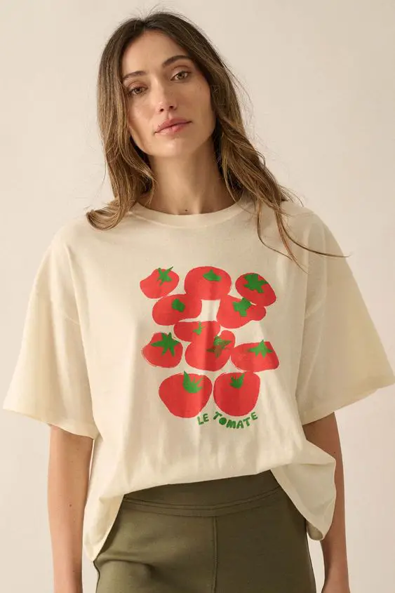 Ця футболка великого розміру зі сміливим томатним принтом, яка передає грайливу сутність, — це все, щоб зробити заяву. Він чудово поєднується з такими трендами, як милі літні футболки для жінок, які шукають унікальний дизайн, що привертає увагу.