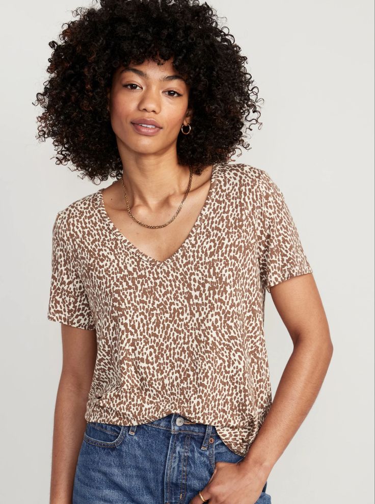Цей образ включає футболку теракотового кольору з леопардовим принтом на плечі, що пропонує стильний акцент на базовій футболці. Цей дизайн ідеально поєднує повсякденність і модність, втілюючи дух милих літніх жіночих футболок.