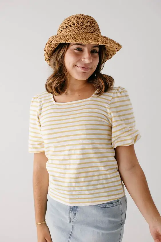 Модель на цьому зображенні одягнена в класичну футболку в рубчик гірчично-жовтого кольору, що демонструє вічну привабливість милих повсякденних літніх футболок – Тенденції 2025. Текстура в рубчик додає нотку елегантності простому дизайну.