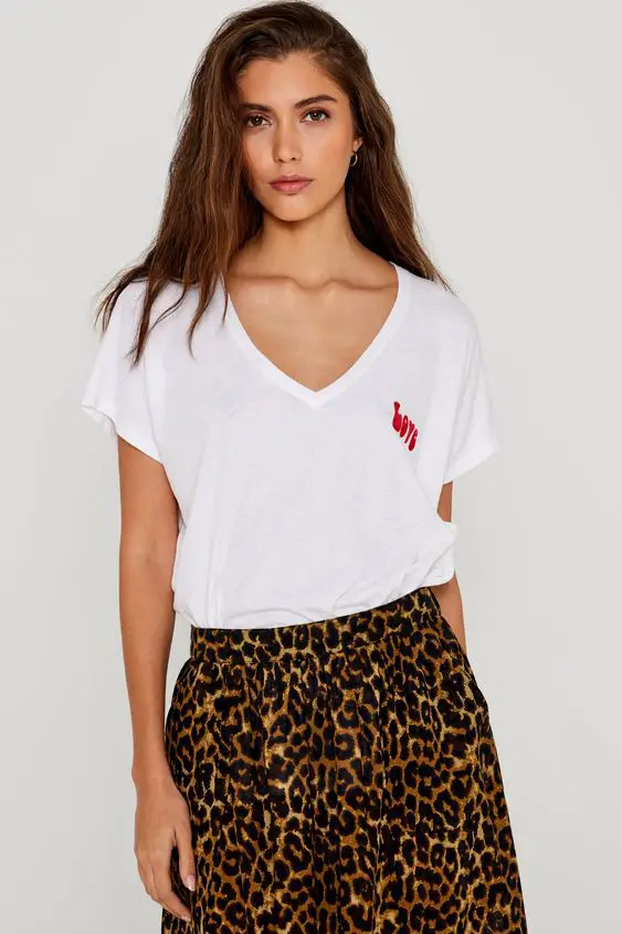 Тут класична біла футболка з v-подібним вирізом грайливо доповнена невеликою червоною вишивкою «любов». Це чудовий приклад милих літніх футболок і безрукавок із тонкими, але чарівними деталями.