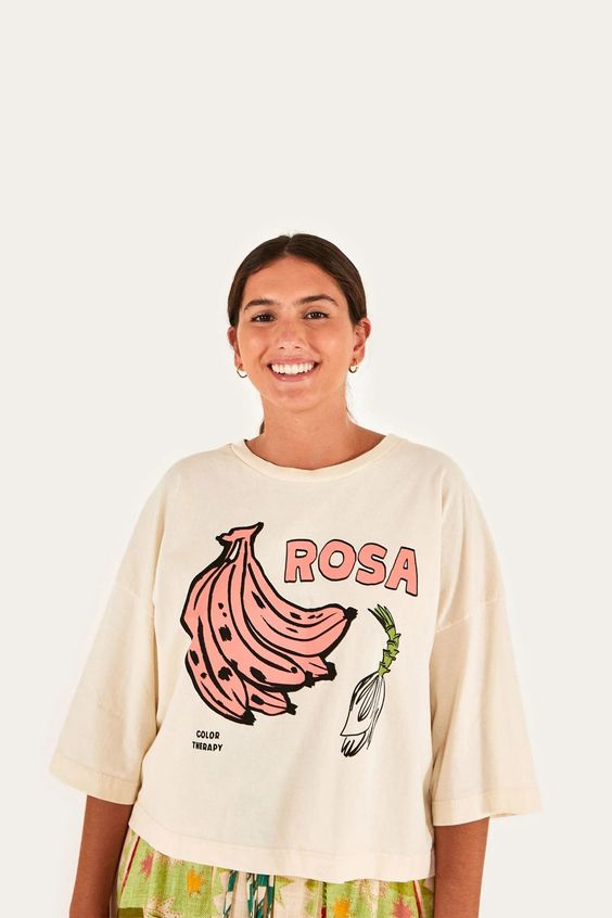 Тут футболка демонструє грайливий ілюстрований принт із зображенням бананів із назвою «ROSA» — знак химерної персоналізації, яка в тренді. Це чудовий приклад милих літніх футболок і безрукавок, які поєднують гумор і моду.