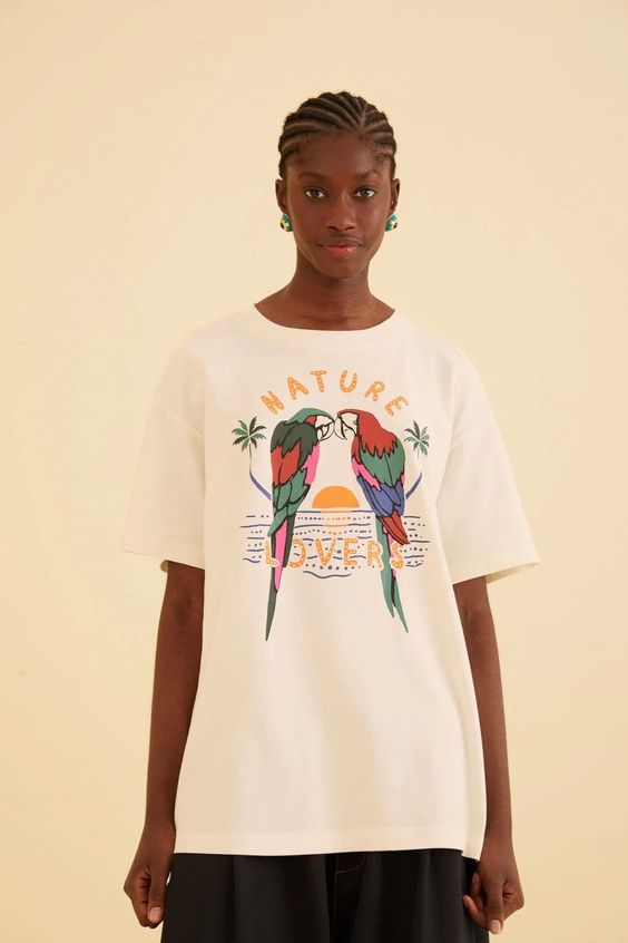 Ця футболка із зображенням спокійної природи з папугами сповіщає про літо. Це ідеально відповідає тенденції екологічної оцінки милих літніх футболок для жінок.