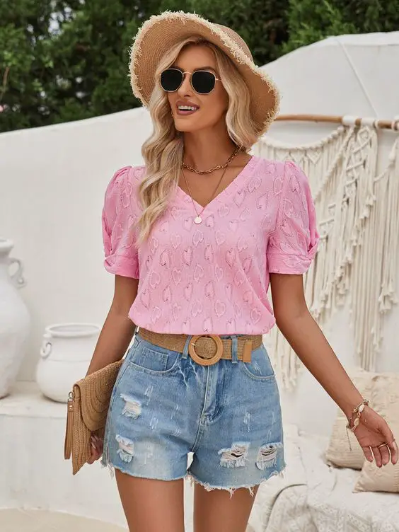 Це зображення демонструє світло-рожеву футболку з тонким принтом у формі серця, що надає їй чарівності та ніжності. Це чудовий приклад того, як милі літні футболки та майки можуть містити ніжні принти, щоб створити м’який, жіночний образ.
