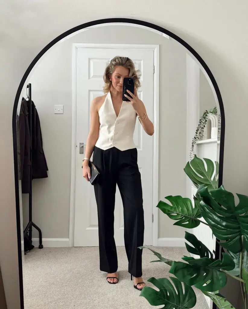Монохромність ніколи не виходить з моди, і вона особливо підійде жінкам старше 40 років. Перший ансамбль випромінює елегантну вишуканість із атласним топом кольору слонової кістки, який витончено доповнює фігуру та створює розкішний контраст із чорними брюками. Дизайн із завищеною талією обтягує талію, подовжуючи ноги — універсальний стиль.