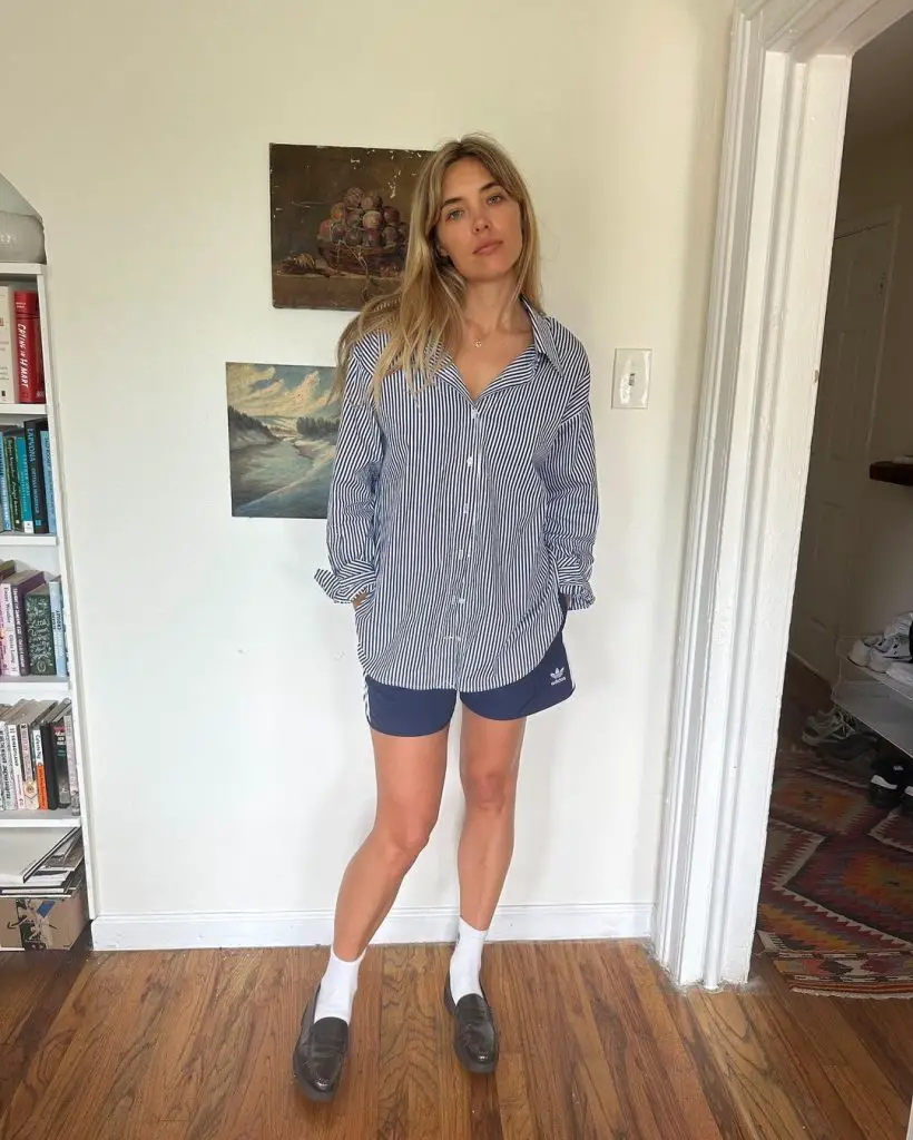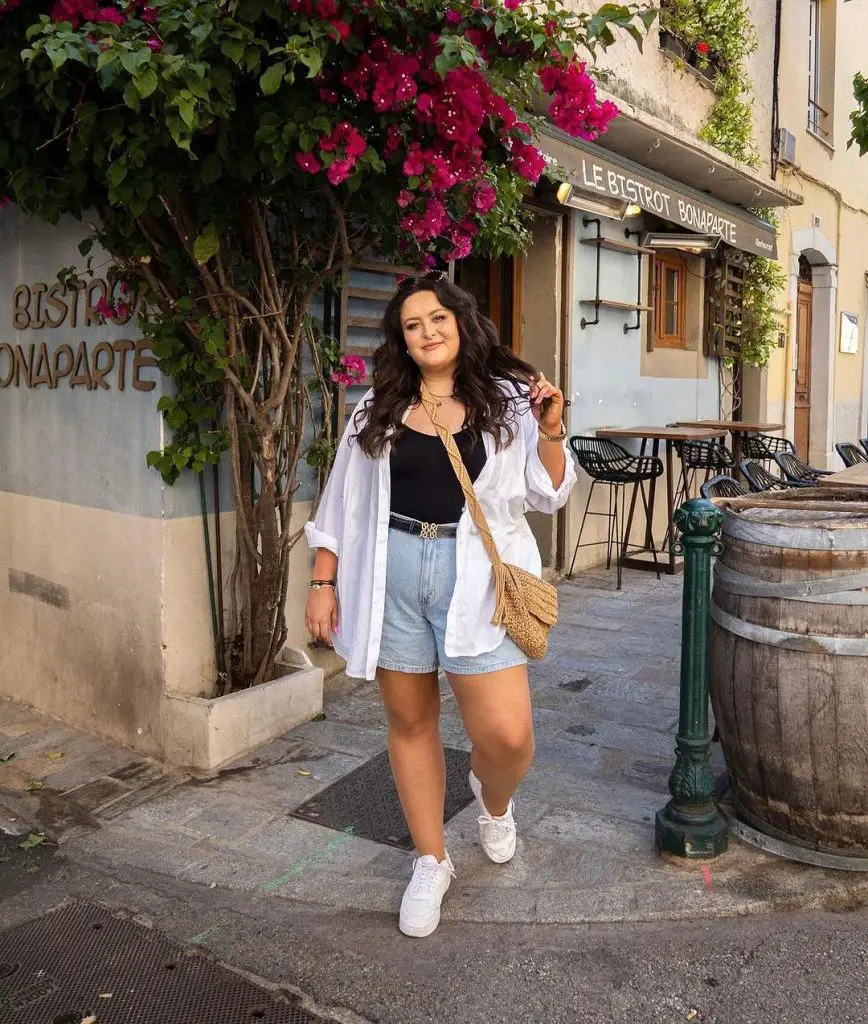 Відтворення морської атмосфери — це позачасовий тренд для літнього вбрання для жінок старше 40 років. Витончена біла сорочка в поєднанні з темно-синіми шортами в білу смужку створює класичний, але свіжий образ.