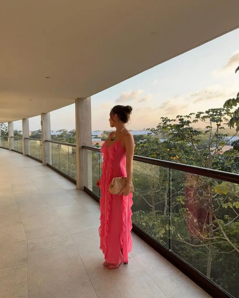 Рожева максі-сукня з рюшами — незамінна літня річ, ідеально підходить для літнього вбрання для жінок старше 40 років. Її яскравий відтінок і струмуюча тканина створюють ауру витонченості та грайливості, а сама сукня своєю довжиною та вертикальними воланами підходить для високого зросту.