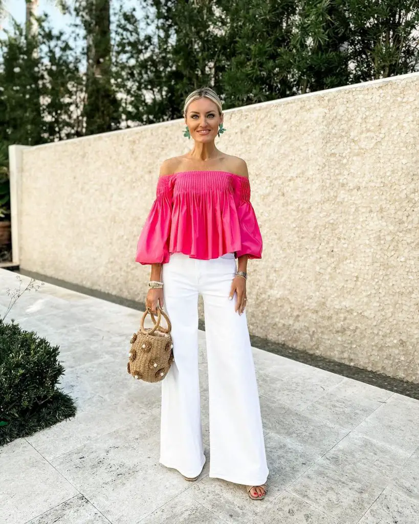 Топ із відкритими плечима в яскравому рожевому кольорі в поєднанні з білими штанами з широкими штанинами — ідеальний варіант для модного літнього вбрання для 40 літніх жінок. Цей ансамбль одночасно відповідає моді та віку, вражаючи ідеальний баланс між модним і позачасовим.