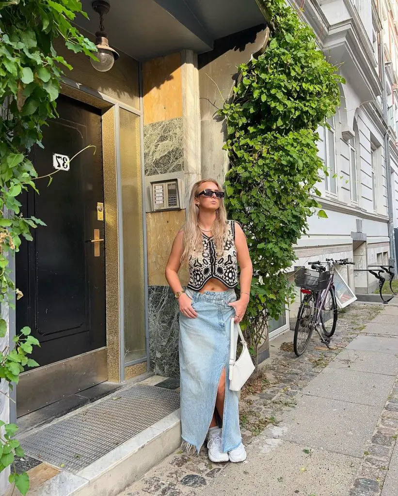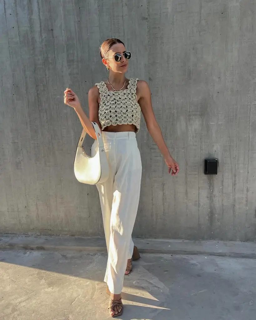 Прийміть богемний дух із в’язаним топом ручної роботи, який ідеально підходить для тих, хто шукає ідеї літнього вбрання для жінок старше 40 років. У поєднанні з лляними брюками з високою талією це вбрання говорить про ремісничу елегантність і невимушену розкіш.