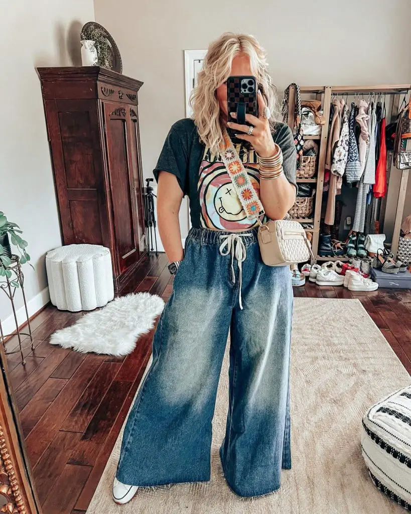 Денім не обов’язково обмежується джинсами. Тут широкі штани з деніму в поєднанні з футболкою з графічним малюнком уособлюють повсякденне літнє вбрання для жінок старше 40 років, які не жертвують стилем заради комфорту.