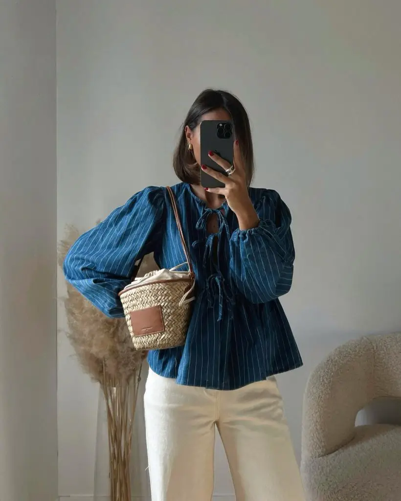 Денім є основним елементом повсякденного літнього вбрання для жінок старше 40 років, і в поєднанні з вертикальними смугами він кричить про невимушений шик. Ця блакитна блуза в смужку з грайливим об’ємом і зав’язаною талією ідеально поєднується з брудно-білими брюками. Смугастий візерунок і невимушений крій облягають фігуру, але не обтяжують її, тому підходять для різних типів фігури.