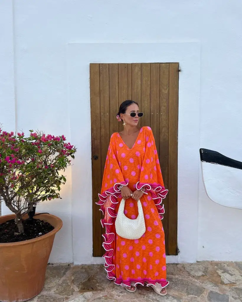 Просочений сміливим помаранчевим відтінком і прикрашений грайливим горошком, цей кафтан є втіленням літнього вбрання для жінок старше 40 років. Це одяг, який обіцяє комфорт і драматизм завдяки своїй струмливій тканині та вражаючим деталям із воланами.