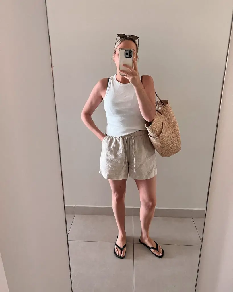 Лляні шорти є основним елементом літа, і цей ансамбль є чудовим прикладом повсякденного літнього вбрання для жінок старше 40. У поєднанні з безрукавкою це одяг, який є водночас шикарним і простим, ідеальним для спекотних літніх днів.