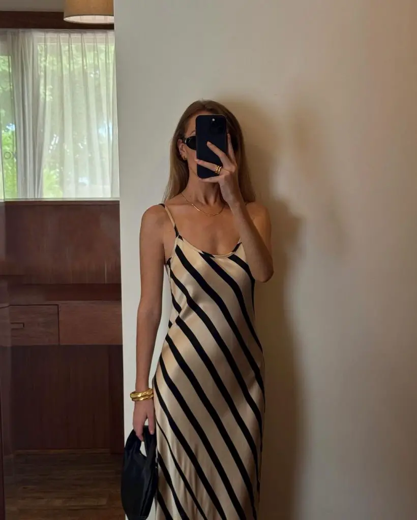 Щоб доповнити цей образ, подумайте про легкий блейзер для прохолодних вечорів. Яскраве намисто тут було б надмірністю — натомість дотримуйтеся мінімалістичної атмосфери сонцезахисних окулярів і витонченої сумки.