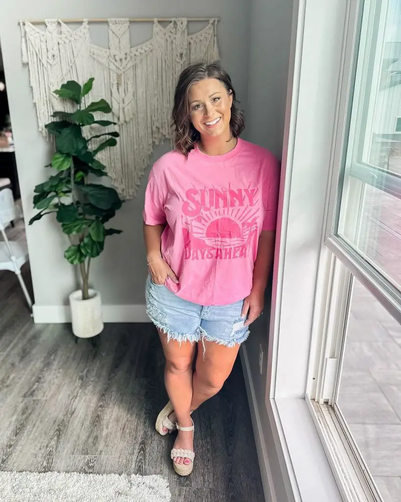 Цей образ є урочистістю милого літнього вбрання для жінок старше 40. Рожева футболка з графічним малюнком додає нотки молодості та врівноважена джинсовими шортами з відрізами, створюючи атмосферу, готову до вихідних. Це практичний, легкий і стильний — трифект літнього повсякденного одягу.