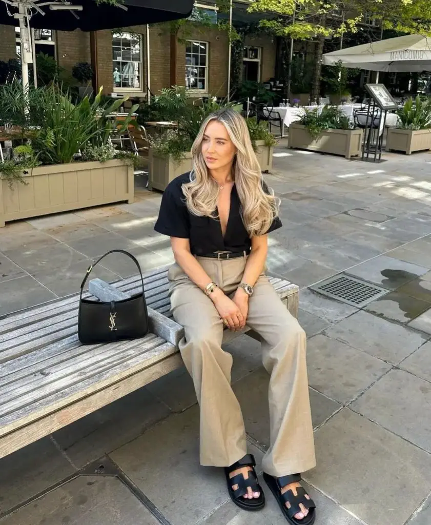 Елегантні, покроєні речі є основою ідей для літнього вбрання для жінок старше 40 років. Цей ансамбль включає в себе вишуканий чорний топ і бежеві широкі брюки, що створює збалансований і сучасний силует. Невимушений крій зручний для літа, залишаючись вишуканим.