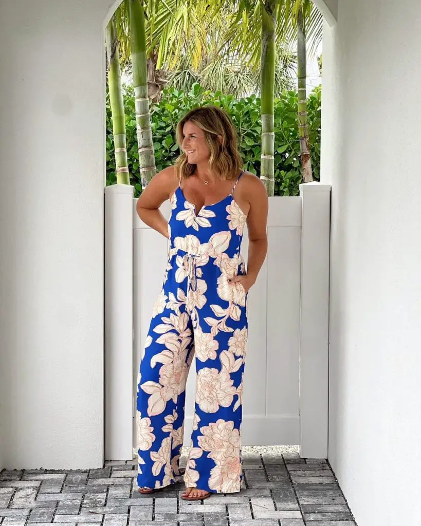 Цей квітковий комбінезон є свідченням милого літнього вбрання для жінок старше 40 років. Яскравий блакитний колір із великими квітковими принтами робить акцент, але не надто зухвалий, тоді як крій комбінезона підкреслює пишну фігуру, окреслюючи талію та витончено обтікаючи стегна.