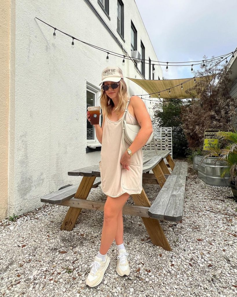Простота є ключовою для літнього вбрання жінок старше 40, і ця міні-сукня нейтрального тону є втіленням цього. У поєднанні з модними кросівками та кепкою це ідеальний образ для повсякденного дня або випивки кави, забезпечуючи комфорт і стиль.