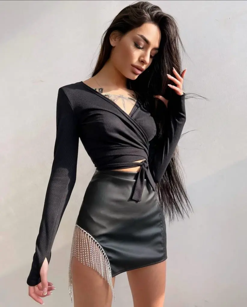 Цей сміливий образ включає витончену чорну міні-спідницю з унікальною металевою бахромою, яка створює гострий вечір. Це втілення модної літньої спідниці, призначеної для вечора.