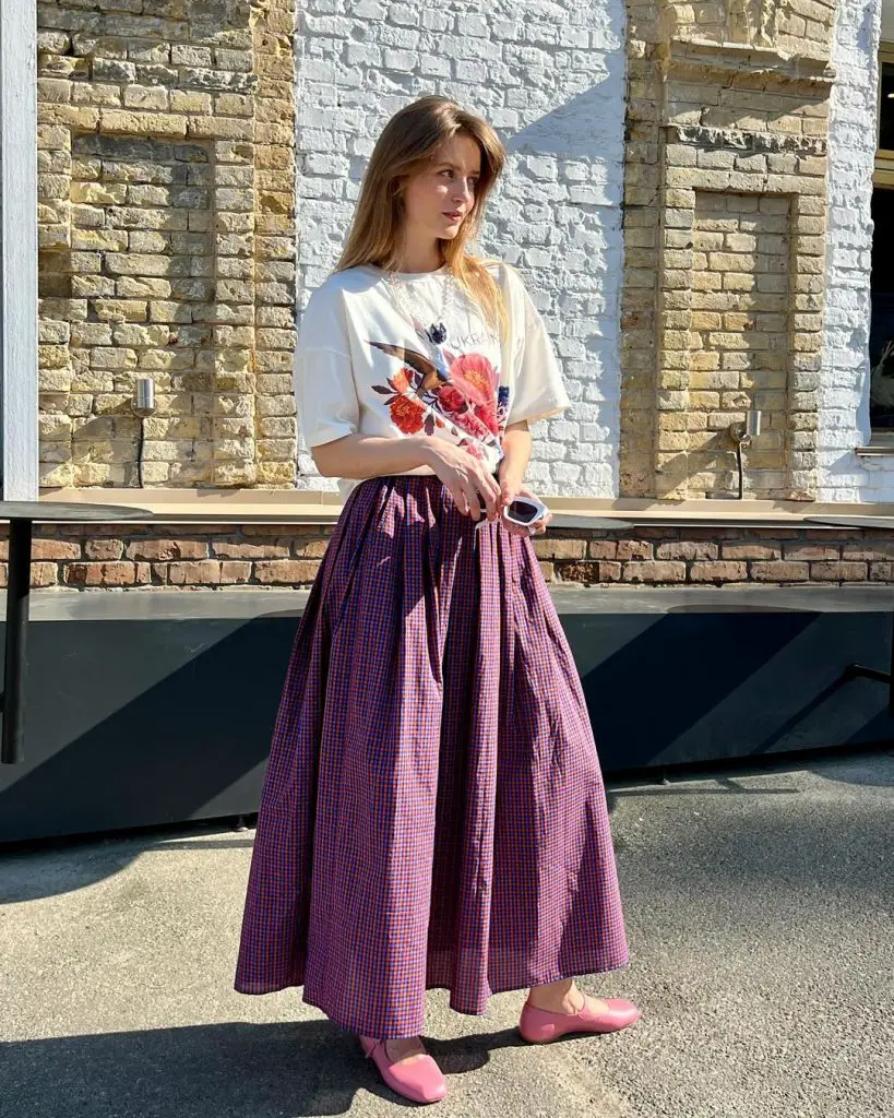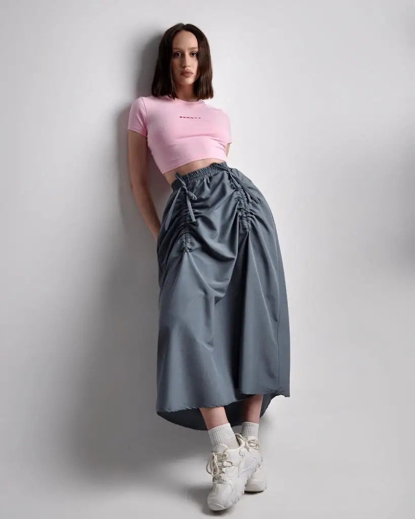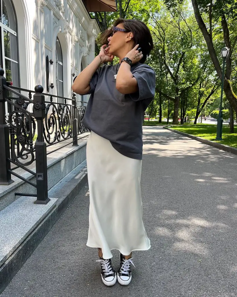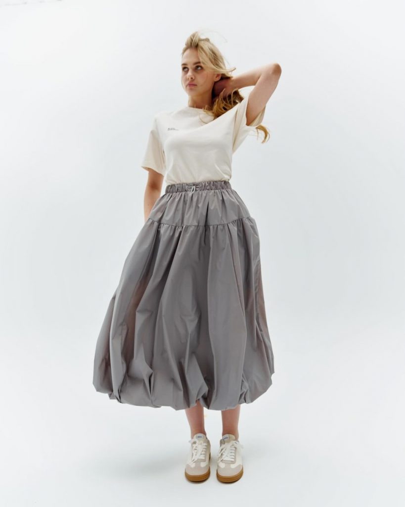Об’ємна сіра спідниця міді в поєднанні з простою білою футболкою в цьому одязі поєднує в собі легкість і грайливість, що підходить для відпочинку чи творчості. Це ідеальний приклад модних спідниць довгого літа.
