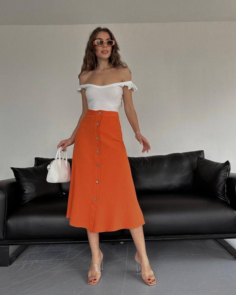 Ця яскрава помаранчева спідниця міді з деталями на ґудзиках спереду дарує свіжий колір і ідеально підходить для літніх прогулянок. Його А-силует підходить до різних типів фігури, що робить його універсальним доповненням до будь-якого модного гардеробу.