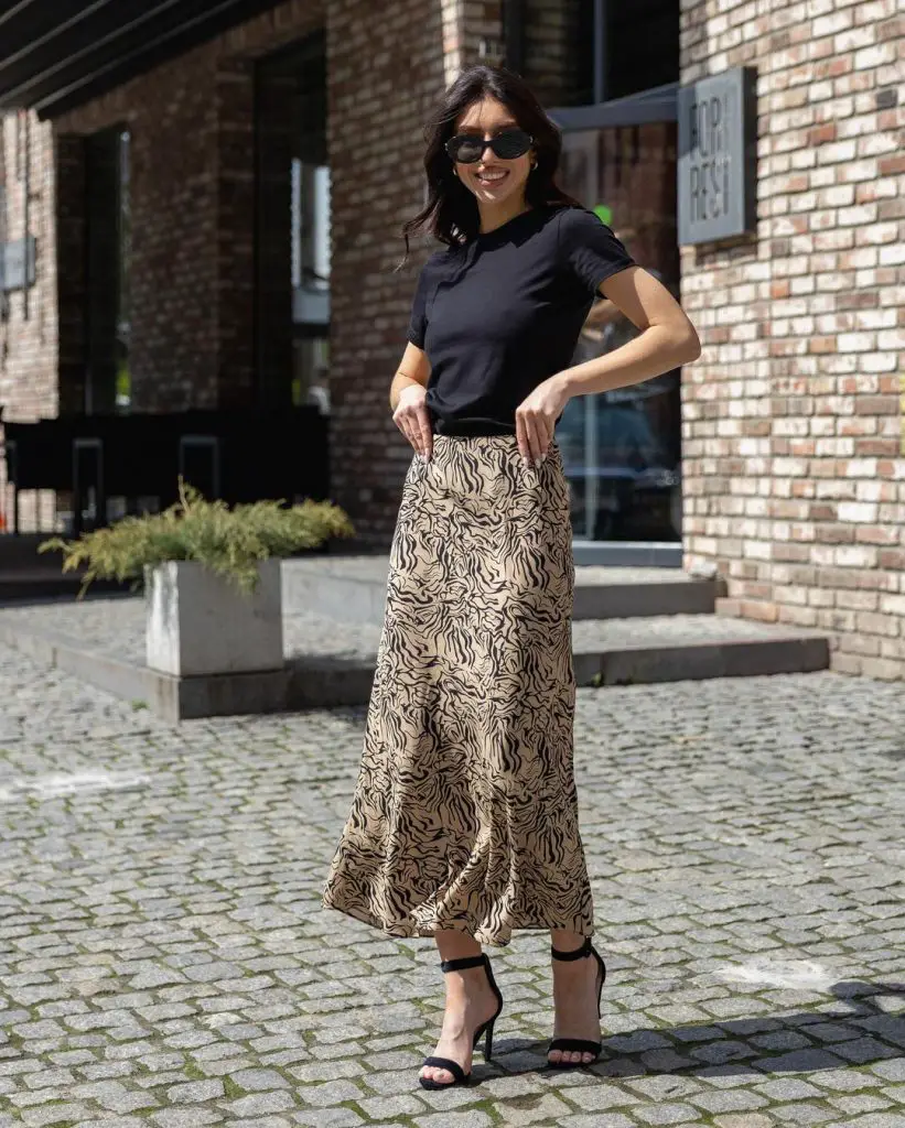 Цей привабливий ансамбль включає спідницю з леопардовим принтом, яка є основним елементом модних літніх нарядів зі спідницями міді. Ця модель поєднується з класичною білою футболкою, поєднуючи повсякденний комфорт із відтінком елегантності, ідеально підходить для різних випадків, від офісу до прогулянок у вихідні.