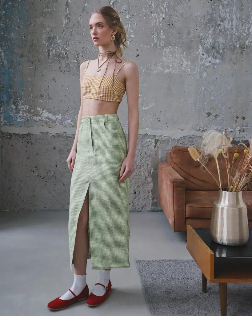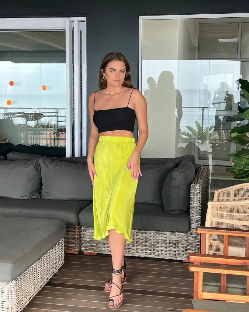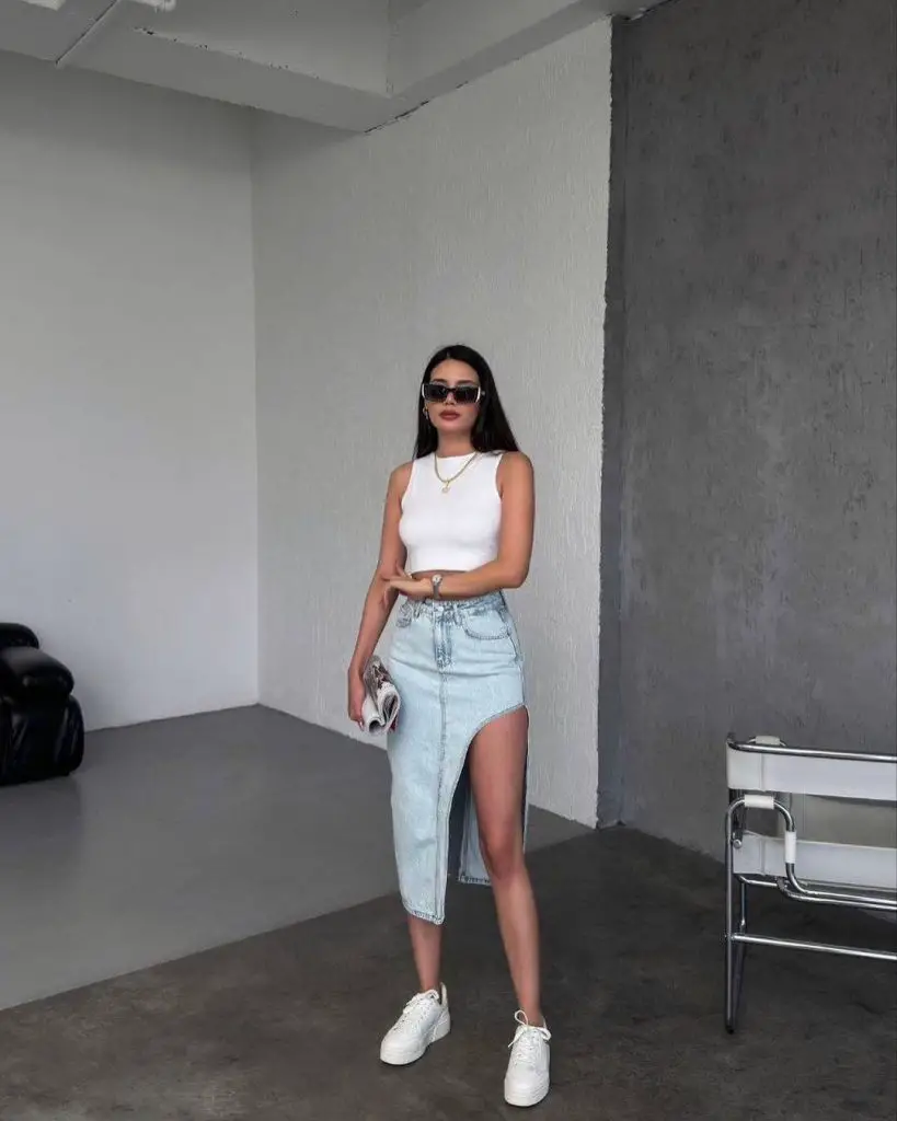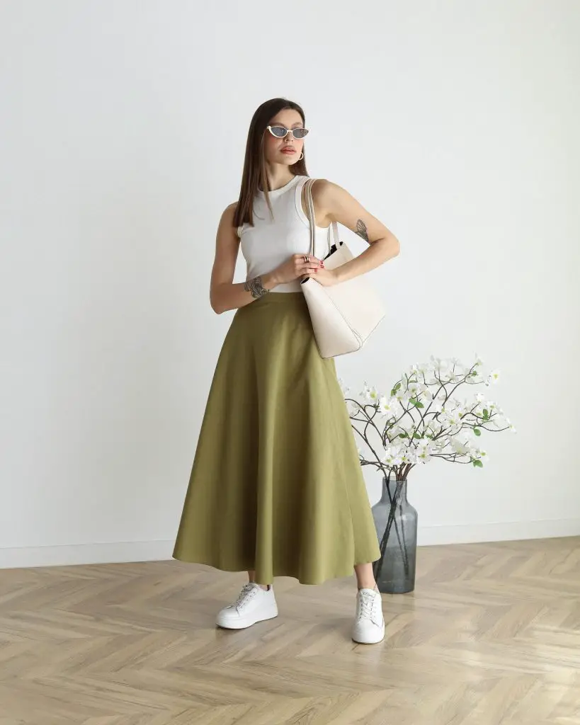 На цьому образі зображено шикарну оливково-зелену спідницю міді в поєднанні з білою укороченою майкою, що ідеально підходить для тих, хто цінує комфорт без шкоди для стилю. Цей модний образ із літніми спідницями підходить для повсякденного дня чи напівофіційного заходу.