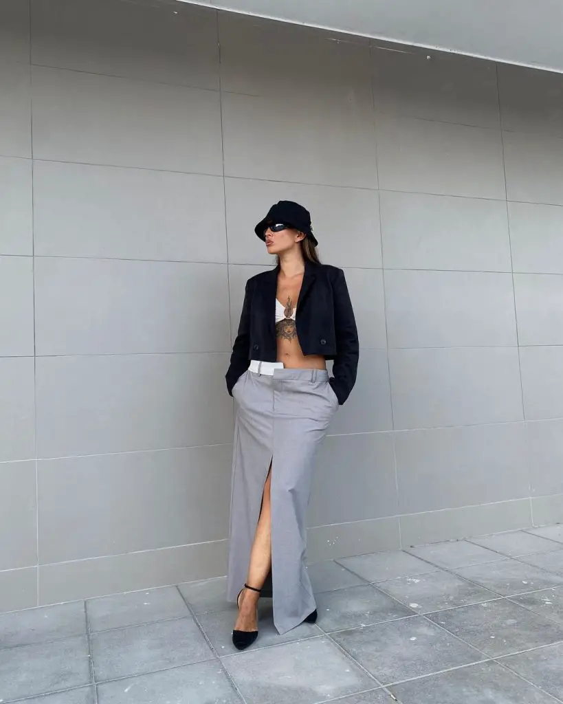 Сіра довга спідниця, зображена на цьому образі, випромінює витонченість завдяки мінімалістичному дизайну та високому розрізу, пропонуючи поєднання комфорту та стилю, що ідеально підходить для ділового повсякденного чи офіційного відпочинку.