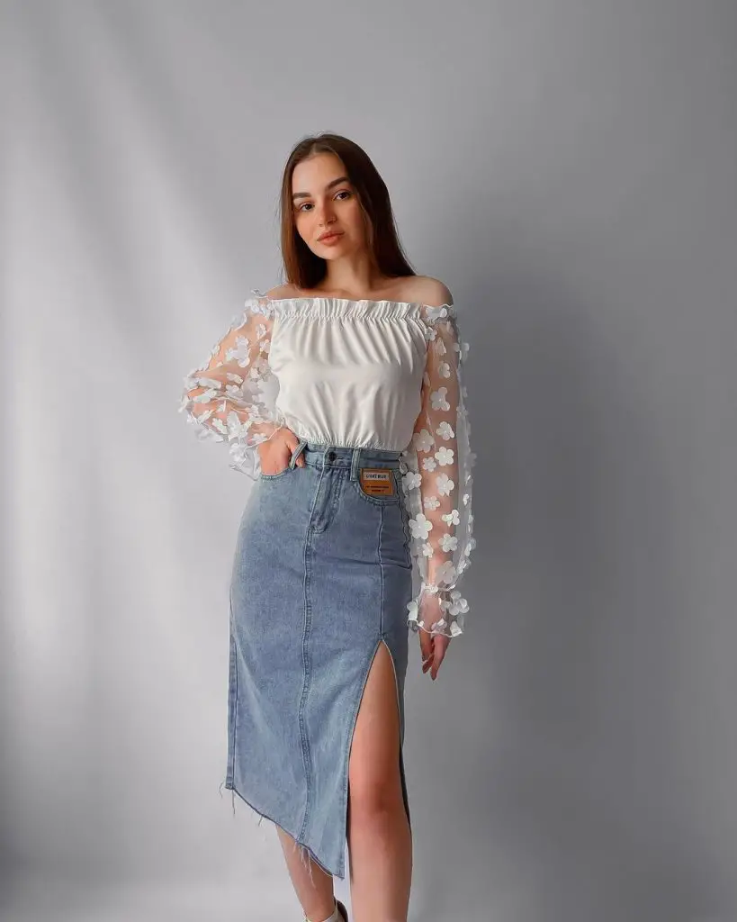 Тут ми бачимо сучасний погляд на класичну джинсову спідницю з високим розрізом, який додає сучасності. Ця спідниця ідеально підходить для тих, хто хоче поєднати комфорт із ноткою сучасного стилю.