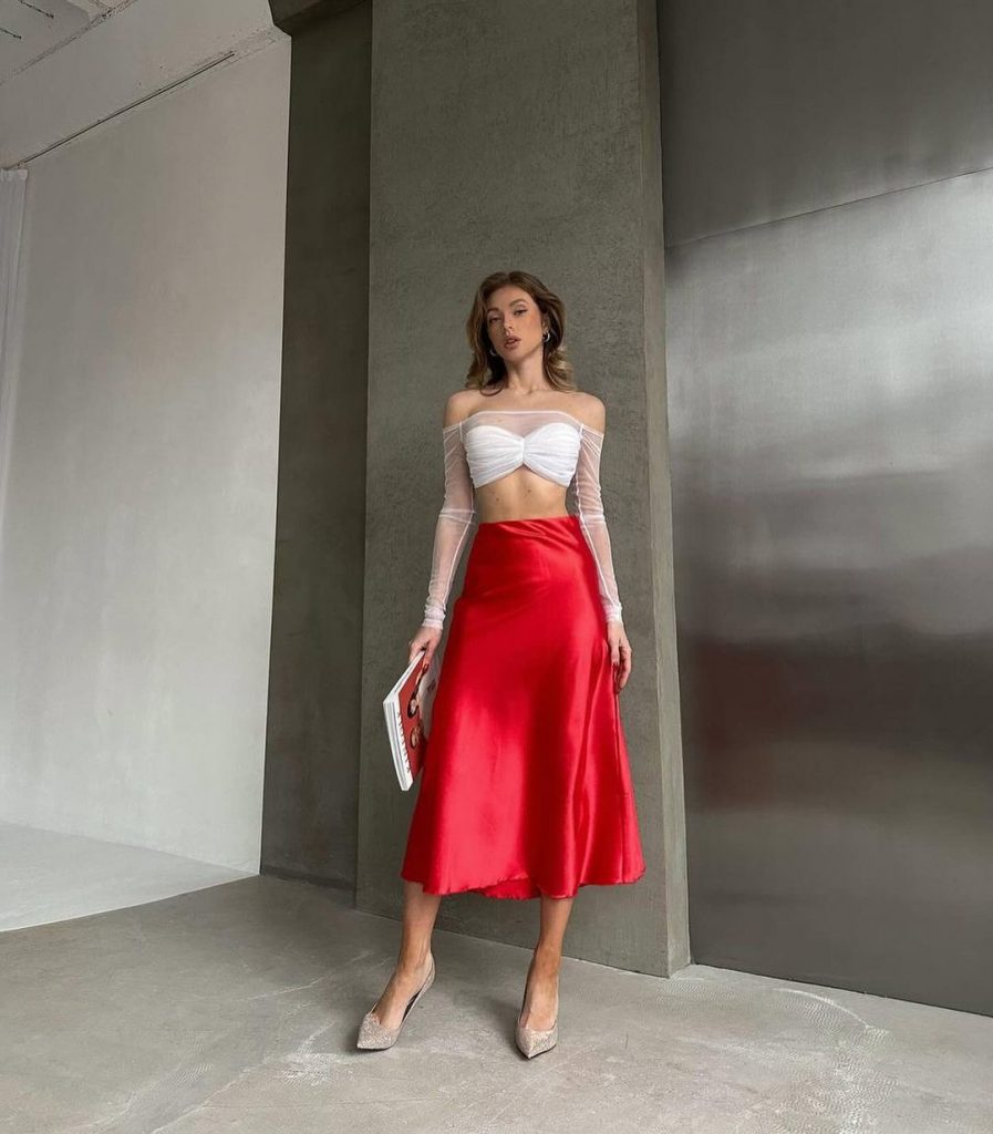 Завдяки приголомшливій червоній атласній спідниці міді в поєднанні зі структурованим білим кроп-топом, цей одяг є втіленням розкоші та сучасності, підходить для офіційних заходів або стильного ділового повсякденного відпочинку.
