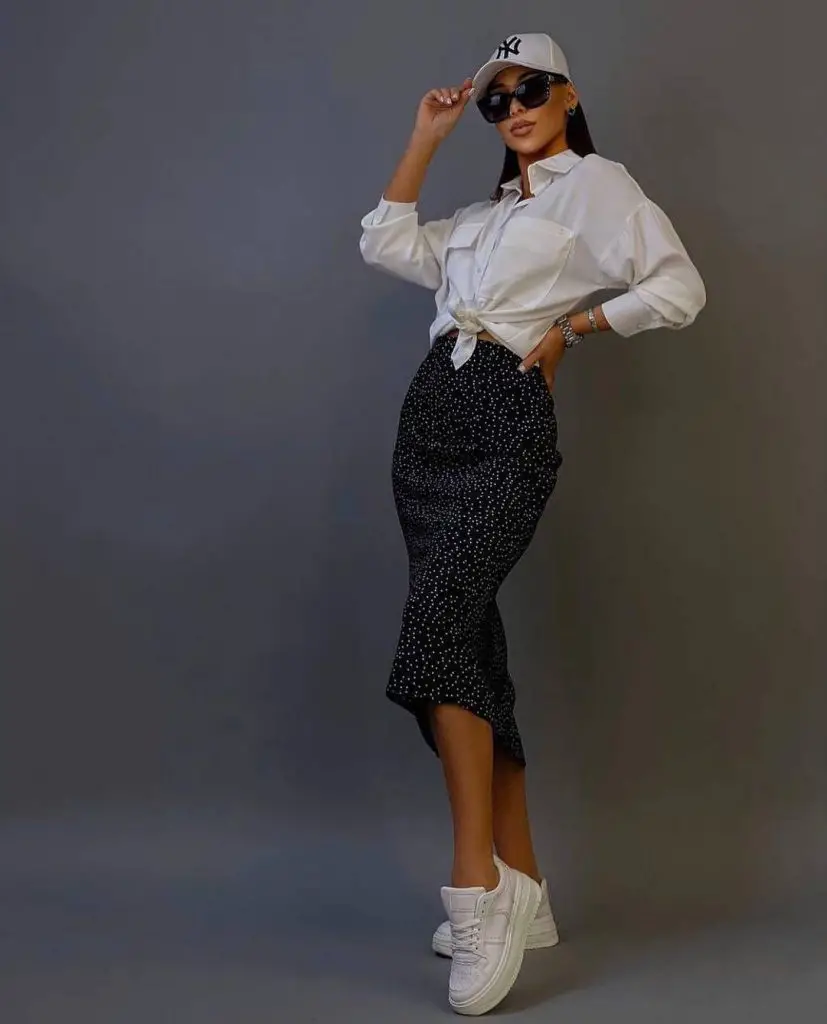 Цей ансамбль демонструє сучасний міський шик, який поєднує класичні елементи зі спортивними нотками. Ця модель має спідницю-олівець у горошок у поєднанні з білою сорочкою на ґудзиках, вміло зав’язаною на талії для невимушеного, але вишуканого вигляду.