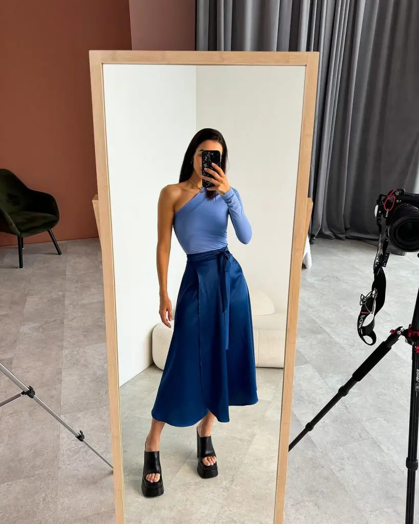 Цей образ підкреслює витончену блакитну спідницю міді з асиметричною зав’язкою, яка додає елегантний відтінок класичному силуету. Це модна спідниця, яка поєднує функціональність із високою модою.