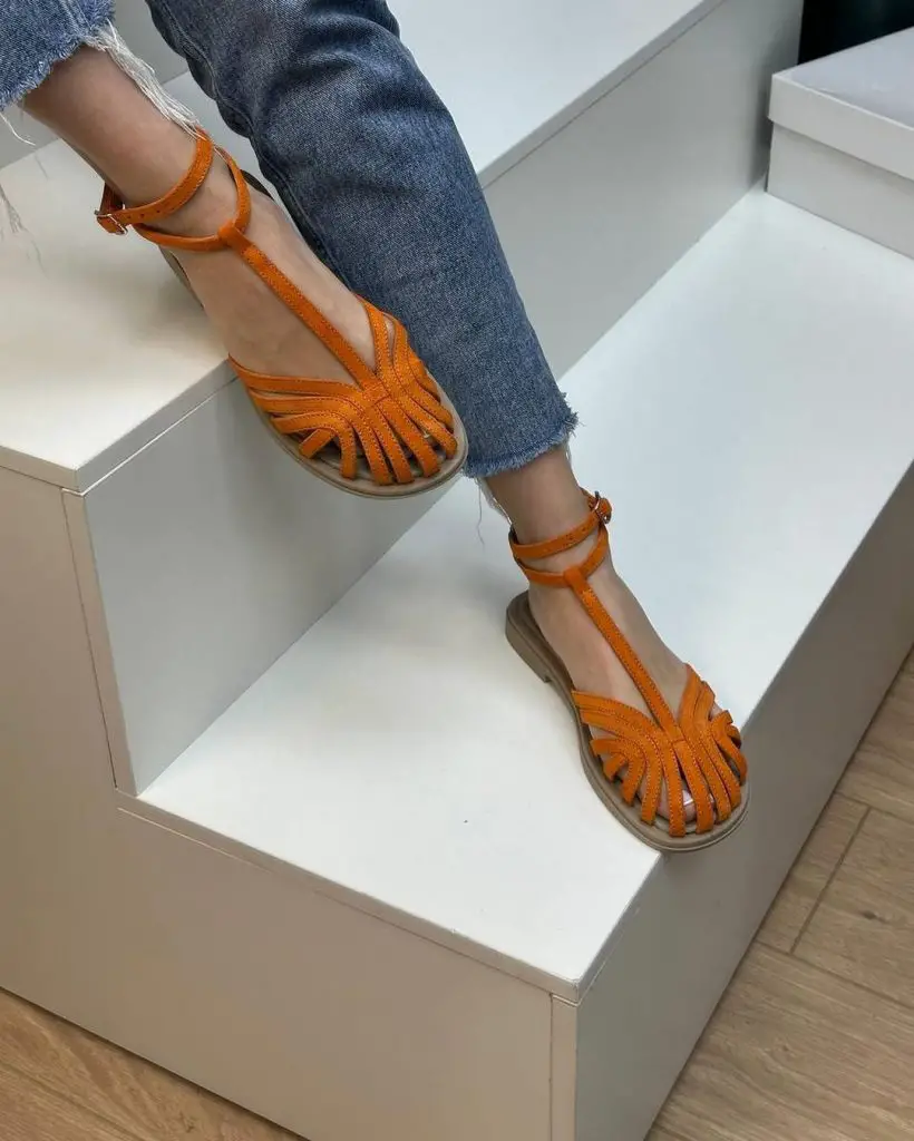Дев’ятнадцяте зображення демонструє яскраву пару милих літніх туфель для жінки. Помаранчеві босоніжки зі складними деталями привертають увагу та ідеально підходять для будь-якого літнього дня.