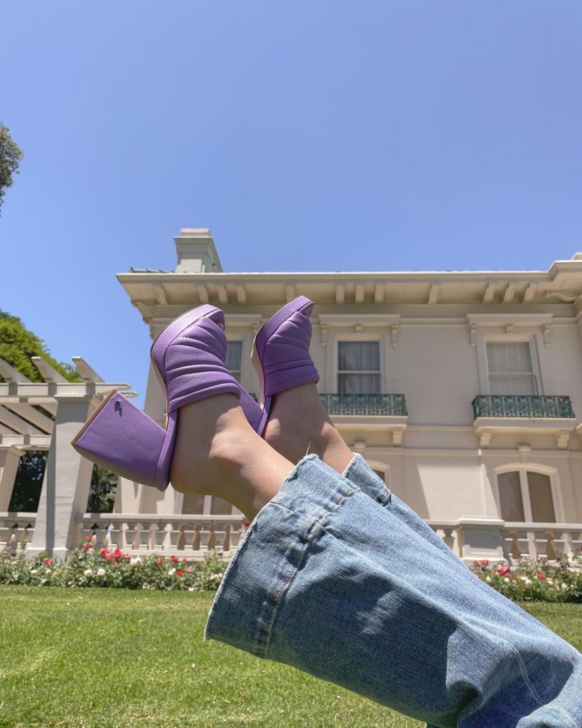 Четверте зображення показує пару фіолетових літніх жіночих босоніжок, які втілюють шикарну простоту з витонченим родзинкою. З елегантними ремінцями та скромним каблуком ці босоніжки ідеально підійдуть як для офісу, так і для вихідних.