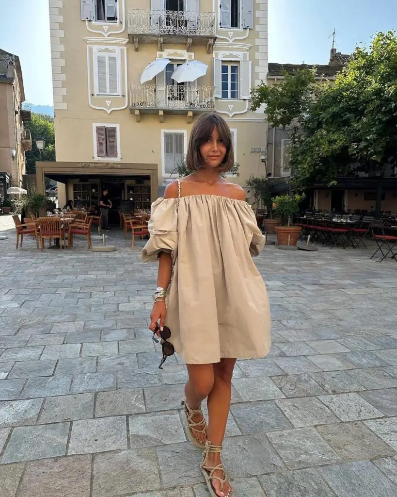 Опис: це зображення втілює естетику розслабленого літнього вбрання з богемним відтінком. Він має вільну бежеву сукню з відкритими плечима, яка кричить про літню легкість і елегантність, ідеально підходить для пляжного дня чи випадкової зустрічі.