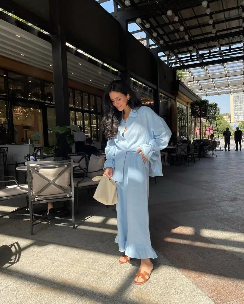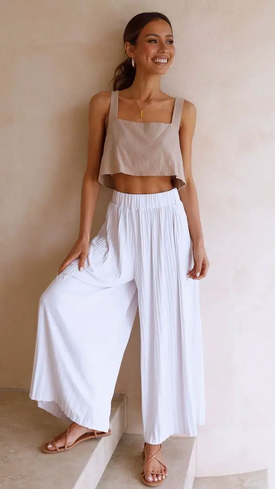 Думка: додавання легкого блейзера може ще більше покращити цей образ, зробивши його придатним для професійного відпочинку чи прохолодних вечорів. Уникайте важких черевиків або офіційних каблуків, щоб одяг залишався легким і відповідним для літа.