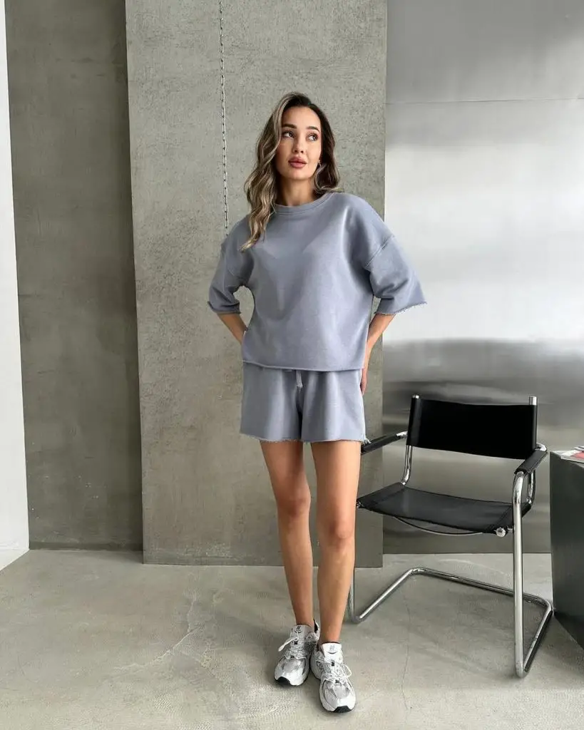 Опис: демонструючи мінімалістичний і сучасний підхід, дванадцята фотографія представляє розслаблене літнє повсякденне вбрання у спортивно-шикарному сірому світшоті та шортах, ідеальне для повсякденного дня чи активного дня.