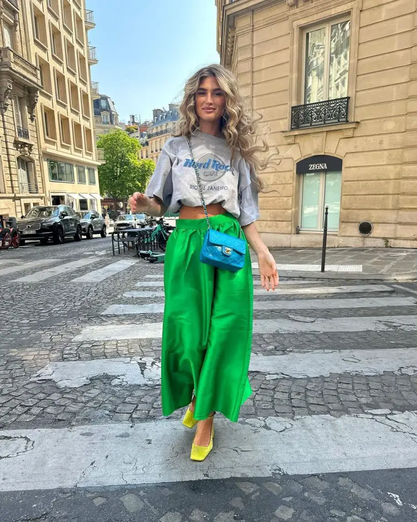 Думка: підкресливши це вбрання стильними прикрасами або навіть кольоровим поясом, ви можете зробити його ще більш привабливим. Важливо зберегти баланс, не перебиваючи яскраву зелену спідницю.