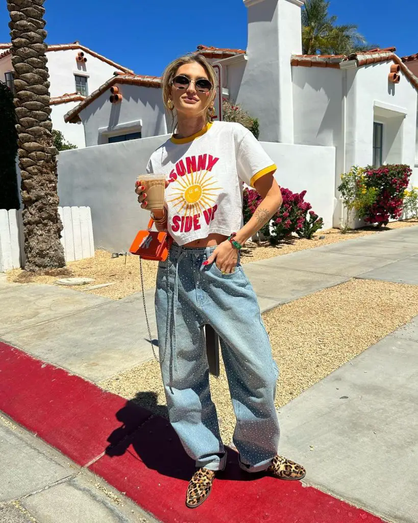 Опис: це повсякденне, але модне вбрання на п’ятнадцятій фотографії ідеально підходить для сонячного дня, грайлива футболка та вільні блискучі джинси, які забезпечують комфорт і стиль, втілюючи розслаблені літні вбрання повсякденного розміру.